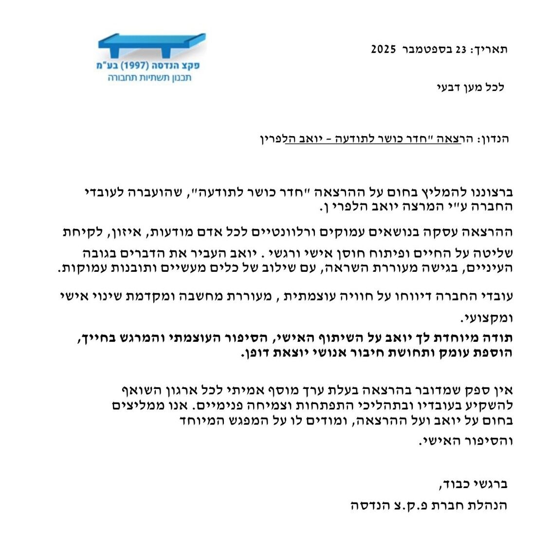 ההרצאה של יואב מעניקה לעובדים כלים להתחיל לראות את עצמם, להשקיע בעצמם ולקחת אחריות על הבריאות הפיזית והמנטלית שלהם. אלו התועלות הקריטיות לארגון שלכם: