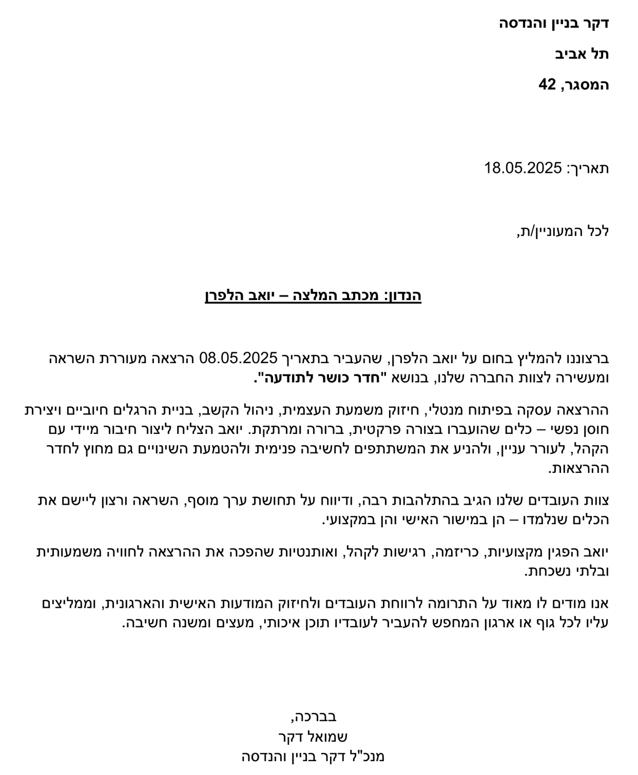 בעולם העסקי התובעני אנחנו רגילים למדוד הצלחה ע"פ יעדים ודו"חות רווח והפסד. אך המנוע האמיתי מאחורי כל המספרים הללו הוא האנשים שלכם. כשעובדים נמצאים בסטרס כרוני, שחוקים או מרגישים שהם הולכים לאיבוד בתוך המירוץ, השורה התחתונה היא שהחברה נפגעת. יואב הלפרן מביא גישה אחרת מבוססת, מתוך הבנה עמוקה של השטח העסקי וההנדסי. הוא מציע לארגון השקעה עם החזר גבוה במיוחד (ROI) המתבטאת ברווחת העובד.